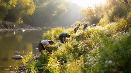 People collect plants along the riverbank during morning light in a natural area