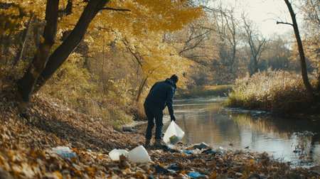 An environmental scientist analyzes a water sample collected from a river during autumn. Dressed in protective gear, she demonstrates the importance of water quality monitoring amid colorful foliage.