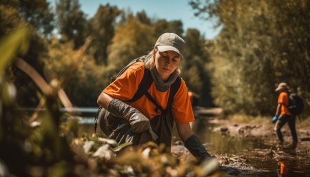 A group of women volunteers are collecting plastic trash along the river. ai
