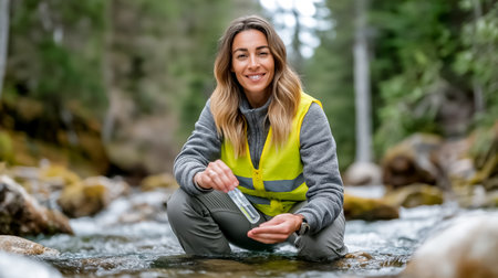 A dedicated female scientist crouches beside a serene stream, carefully collecting a water sample for environmental research, showcasing the importance of ecology.