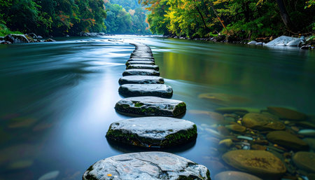A tranquil path of stepping stones offers a clear way forward across the smooth, flowing water of a secluded forest river.