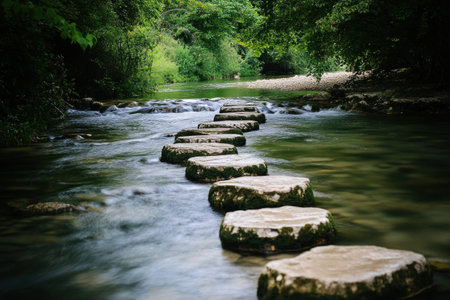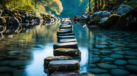 AI Generated. Crossing tranquil waters rocky river pathways serene stream nature exploration lush greenery ground level adventure and relaxation