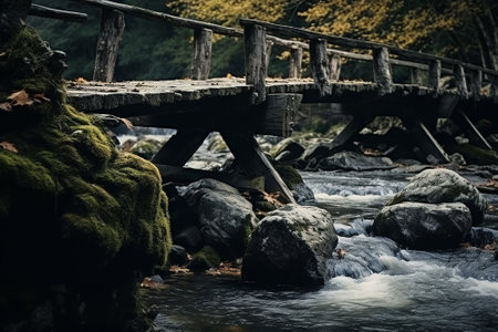 Immerse yourself in the serene beauty of a rustic bridge crossing a quiet stream, bathed in soft morning light This idyllic scene evokes a nostalgic connection with nature, emphasizing timeless simplicity The gentle stream, wooden bridge, and autumnal foliage create a tranquil, peaceful experience, perfect for nature lovers Add this AI Generative
