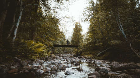 Rear view on a hiker with a backpack, crossing a old wooden footbridge over a rushing mountain stream, encapsulating the spirit of adventure, backcountry hiking concept