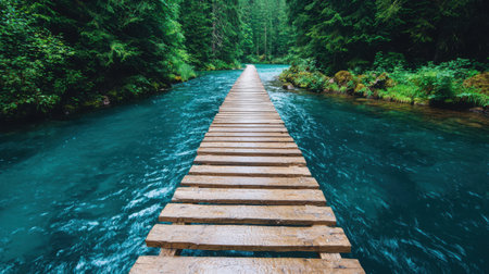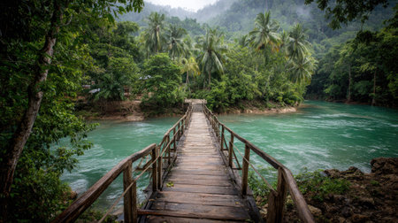 A wooden bridge spans a turquoise river, leading into a dense tropical forest. The image showcases vibrant greens and blues, with a focus on natural textures and perspective. Ideal for illustrating travel, nature, or environmental themes, the scene captures a serene and inviting atmosphere suitable for various commercial applications.