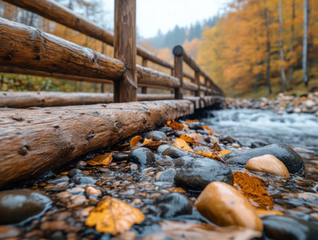Serene wooden bridge spans gentle stream, surrounded by autumn foliage and tall trees. water flows smoothly over rocks, creating peaceful atmosphere in nature