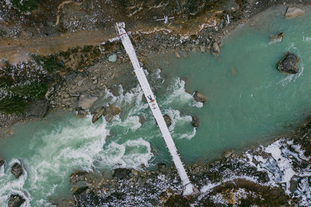 Aerial view of wooden bridge over a mountain river. Top view