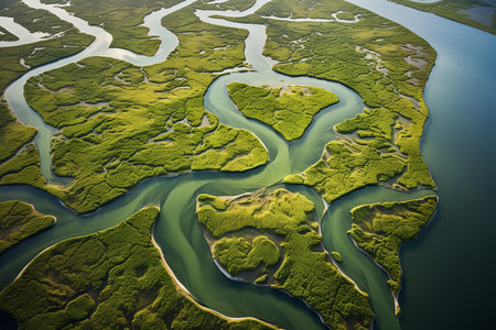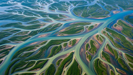 River delta aerial view with intricate network of channels and marshes, natural ecosystem