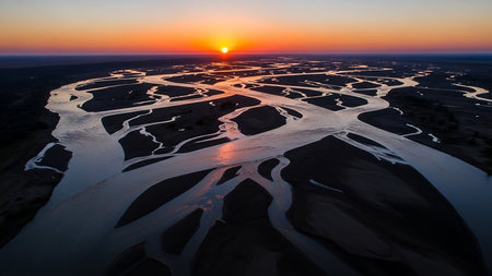 Aerial view of a braided river delta at sunset with the sun low on the horizon and an orange sky.