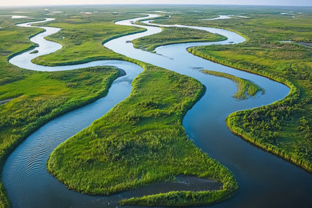 Winding rivers feed the green earth, a natural picture of wetland ecosystems
