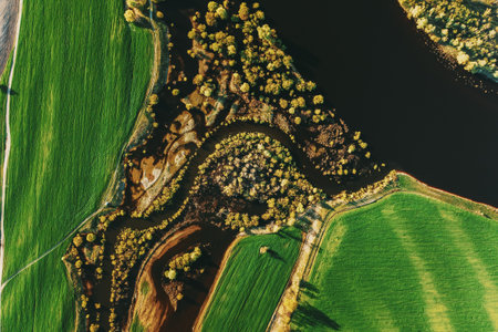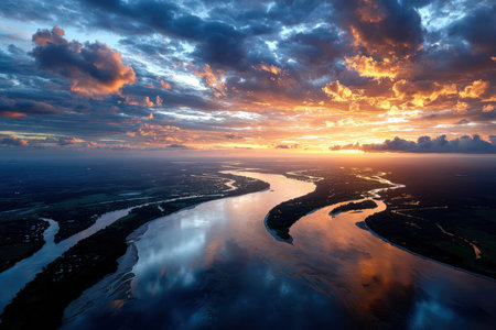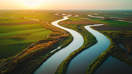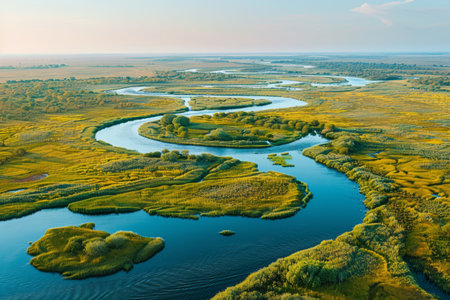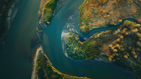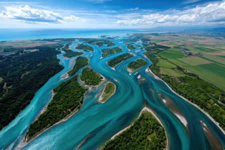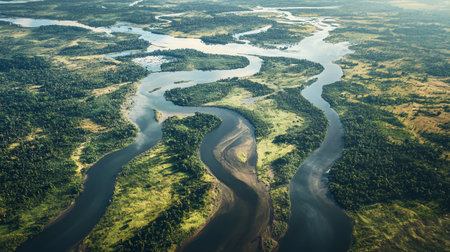 Stunning aerial photograph showcasing the captivating beauty of a serene river delta with its intricate network of winding waterways meandering through a lush