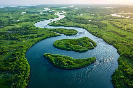 Aerial perspective shows a meandering river surrounded by various green islands and thriving vegetation.
