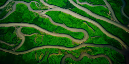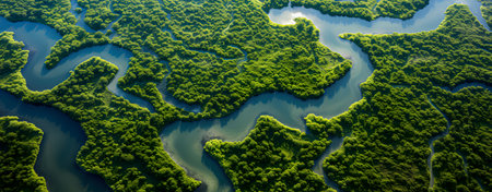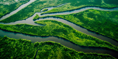 Stunning aerial view of lush green wetlands with dense foliage and winding waterways, showcasing the vibrant natural beauty of the ecosystem.