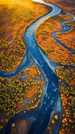 An aerial perspective reveals a dark, winding river snaking through a dense forest. The trees are ablaze with vibrant autumn foliage in shades of green, yellow, orange, and brown, creating a striking contrast with the deep blue water. The river's numerous curves and bends form natural patterns within the lush forest canopy. showcases the serene beauty of nature and the rich colors of the fall season from an overhead viewpoint.
