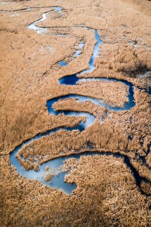 Blue river and brown swamps, aerial view of Poland