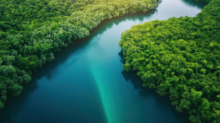 Overhead shot of a winding river cutting through a dense, vibrant green forest, highlighting natures intricate patterns. aerial view. Resplendent.