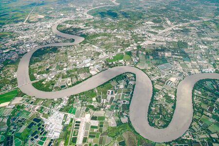 Beautiful Curve River was shot on the plane in the noon. It can see farming and valley all around.