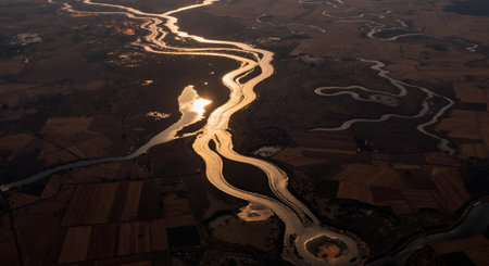 Aerial view of winding rivers flowing through a vast landscape at sunset, highlighting the intricate patterns of nature in this serene location