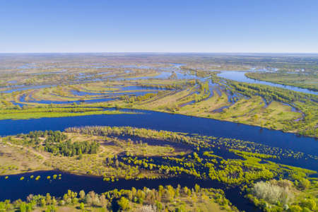 Aerial Flat View Green Meadow, Woods And River Landscape In Sunny Spring Summer Day. Top View Of Nature, Bird's Eye View. Trees Standing In Water During Spring Flood floodwaters. woods in Water deluge During A Spring Flood. Beautiful spring landscape with reflection in river. inundation river.