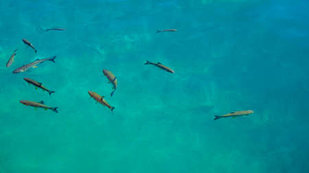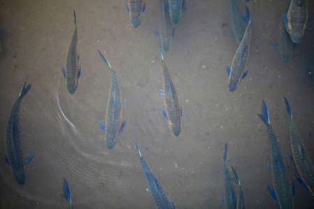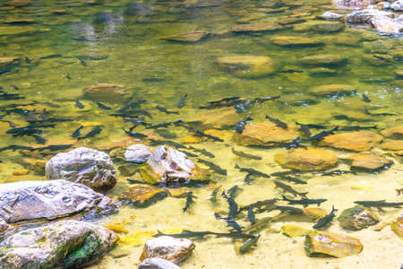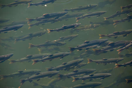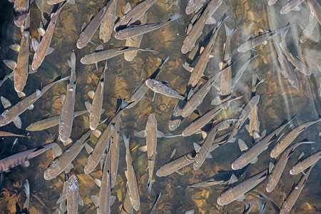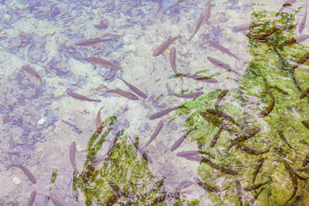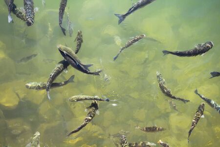 Flock of fish in the river of Croatia national park, River trout, A lot of fish in the water.