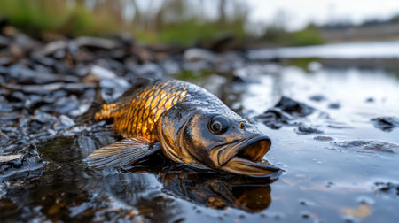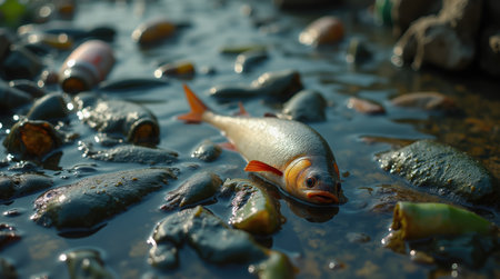 dead fish floating on the surface of a polluted river, created with generative ai