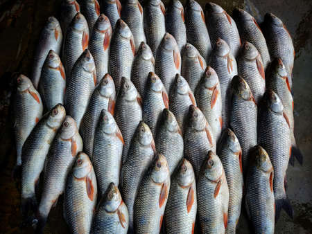 lots of rohu fish labeo rohita fish arranged in line in indian fish market rui fish sale in asia