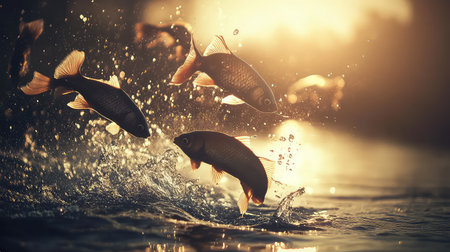 A stunning scene showcasing fish leaping energetically above the water's surface, surrounded by glimmering droplets in the warm glow of sunset.