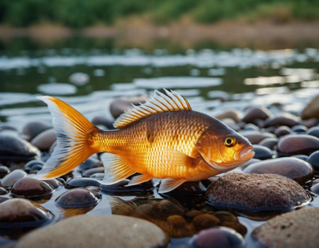 A picturesque river scene featuring vibrant goldfish swimming gracefully among lush greenery and smooth stones, illuminated by sunlight and reflected in clear water.