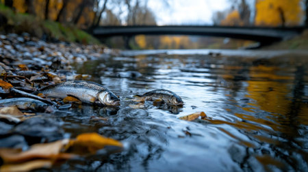 Two fish are swimming in a river with leaves on the ground. The fish are surrounded by leaves and debris, giving the scene a somewhat murky and dirty appearance