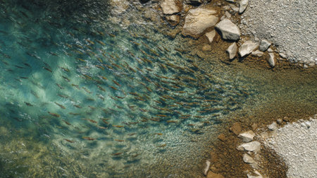A breathtaking aerial view of schools of fish swimming gracefully in clear waters, surrounded by a rocky shoreline and shimmering sunlight.