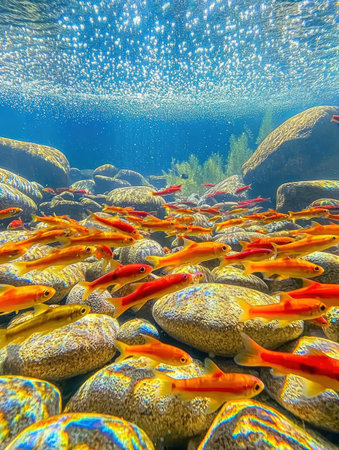 A vibrant underwater scene featuring a school of colorful fish swimming over smooth pebbles, illuminated by sunlight filtering through the water, creating a serene and beautiful aquatic environment.