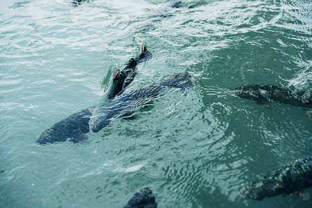 Top view of many carp fish (Cyprinus carpio) swimming at lake