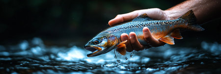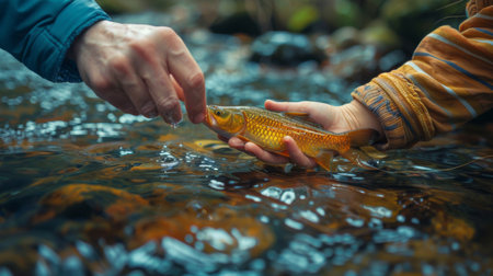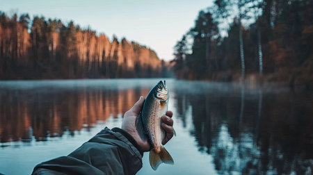 Catch and Release Fishing Experience With a Freshwater Trout at a Serene Riverside Location Surrounded by Nature. Generative AI