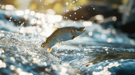 A close-up of a fish mid-jump, its body shimmering in the sunlight as it breaks through the surface of a flowing river