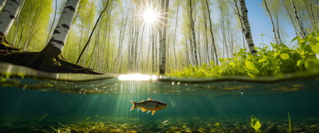 Fish above or under the water of a lake or river in a birch forest on a sunny day. Image on the horizon with water, close-up, copy space