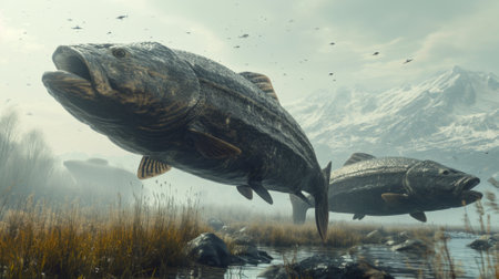 Two large fish swimming in a lake with mountains behind them, AI