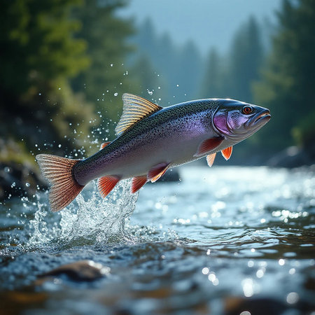 Rainbow trout jumping out of the river with splashes of water