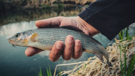 Grayling close-up in the hand of a fisherman.