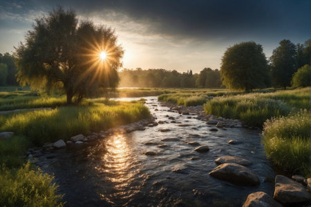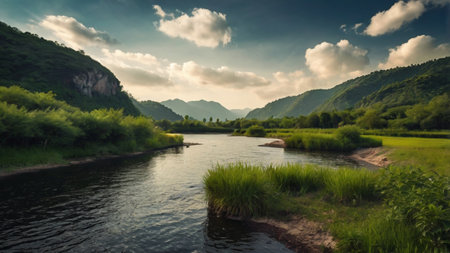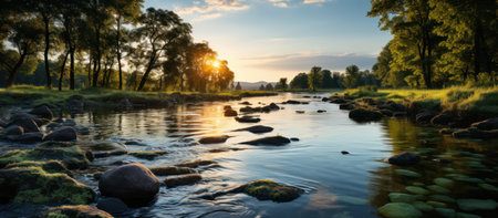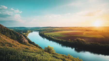 Captivating view of a beautiful river winding through lush green fields under a vibrant sunset sky. The peaceful landscape invites adventure and exploration.