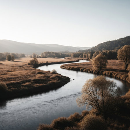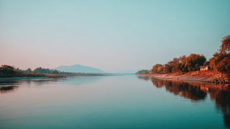 A tranquil river landscape at dawn with soft reflections in calm waters, distant mountains providing a serene backdrop, encapsulating the beauty of nature.