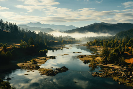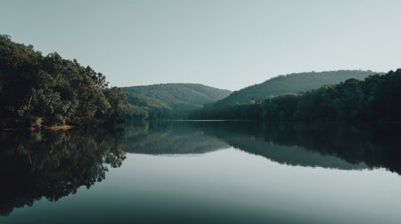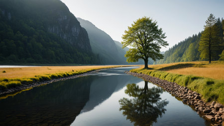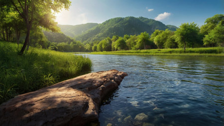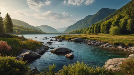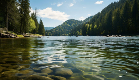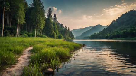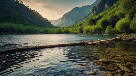 Experience the tranquility of a calm river, reflecting majestic mountains and lush green forests. A serene escape into nature's untouched wilderness.