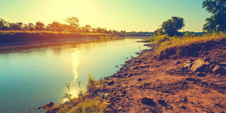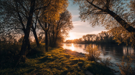 Golden Hour at the Riverbank: Serene Sunset Reflections on Calm Waters