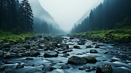 a photo of a misty nature scene with fog rolling over rocks, creating a pensive stillness. the dark turquoise tones add a touch of romance to the 8k resolution image. this swiss realism-inspired photo captures the essence of nature, showcasing a cabincore aesthetic in the serene riverscape. ai generated