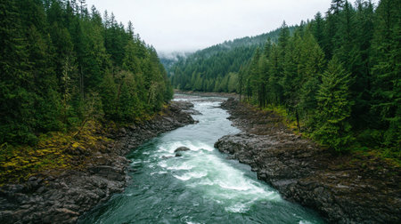 An aerial perspective showcases a river's powerful flow amidst a dense forest. The turquoise water contrasts with the green foliage, creating a dynamic composition. Overhead lighting illuminates the textures of the water and trees. Ideal for illustrating environmental themes and natural beauty, the image suits various editorial or commercial applications.