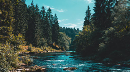Experience the beauty of a serene river flowing through lush green forests under a bright blue sky, capturing the essence of nature's tranquility and peace.