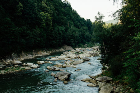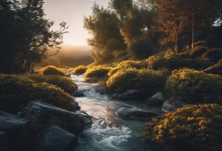 river flowing over moss-covered rocks, surrounded by misty trees, creates a serene and romantic riverscape. the light gray and dark emerald tones add a touch of elegance to this outdoor scene, reminiscent of the works of aleksandr deyneka. the mountainous vistas and calming symmetry further enhance the beauty of this agfa vista photograph. ai generated
