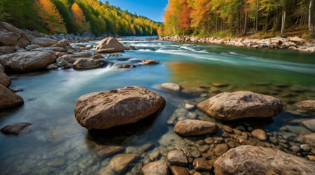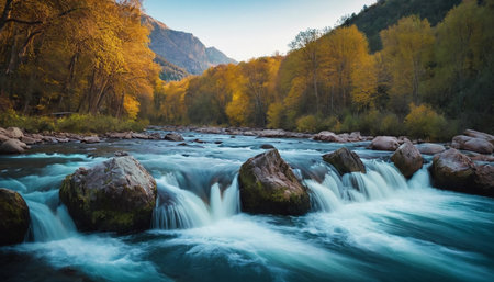 Cascading River Through a Lush Autumn Forest Landscape