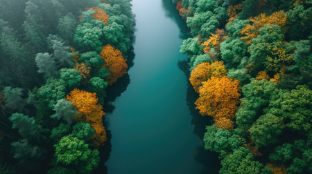 Aerial view of the river flowing through the forest. top view. Generative AI.