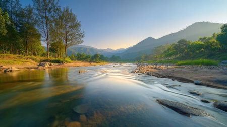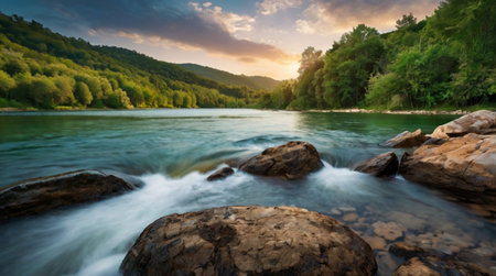 A stunning view of a serene river flowing through lush mountains during sunset. The clear water reflects the sky, creating a tranquil atmosphere in nature.