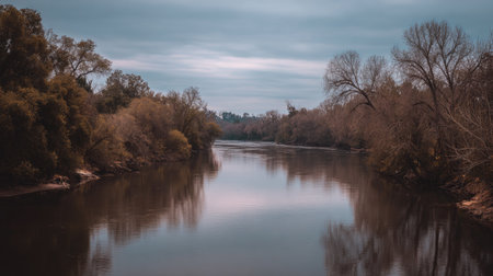 A serene river landscape showcases calm waters reflecting bare trees and a cloudy sky, creating a peaceful atmosphere perfect for nature enthusiasts and photographers.